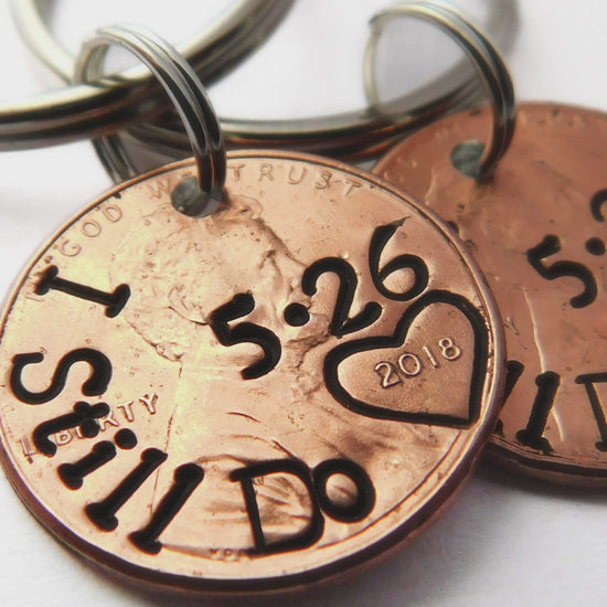 The penny is hand stamped with "I still do" and your special date stamped below it. Aluminum silver disc is stamped with 2 names up to 20 characters total. Real U.S. pennies are used for authenticity. The heart is stamped automatically around the penny year to add a special touch. Please note that stamping on both sides cannot be done due to the nature of hand stamping.