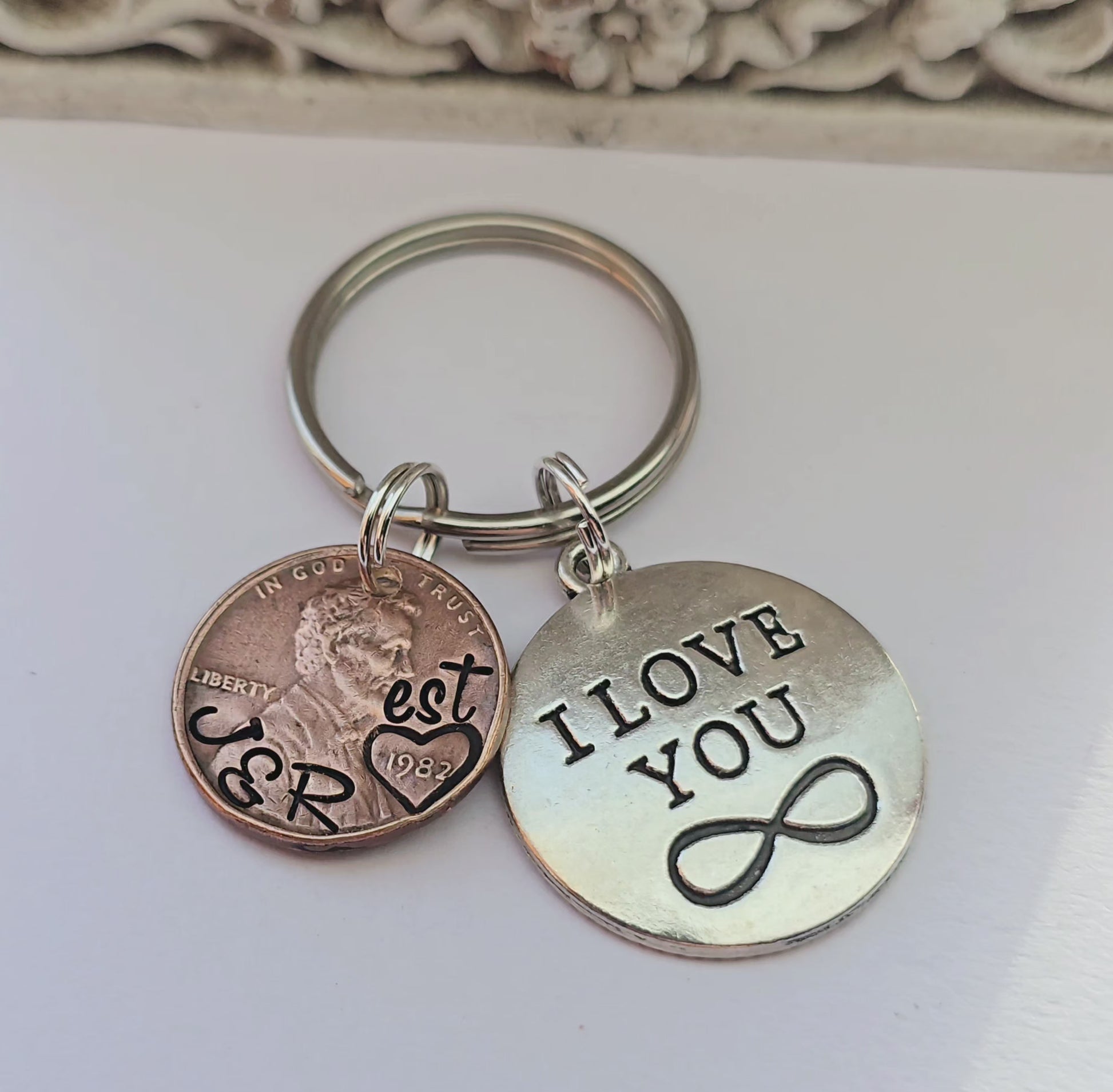 Surprise your loved one with a hand stamped Penny Keychain - a perfect small and meaningful gift for anniversaries or Valentine's Day. Personalized for your husband, wife, boyfriend, or girlfriend, this keychain is sure to bring a smile to their face. Show your love with this unique and thoughtful present!